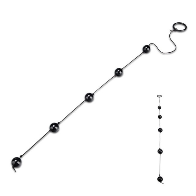 Бусы для анальной стимуляции c пятью пластиковыми бусинами черного цвета. Для извлечения бус предусмотрено тонкое пластиковое кольцо диаметром 32 мм. Диаметр каждой из 5 бусин 18 мм. Веревочка - тканевая. Максимальное удовольствие человек получает во время извлечения бус из анального прохода.