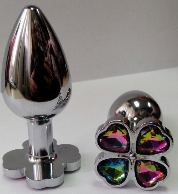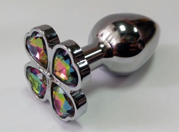 Гладкий маленький серебристая анальная пробочка из отполированной до блеска стали с кристаллом разноцветного цвета!