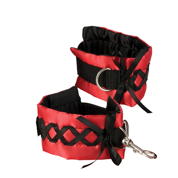 Атласные красные манжеты на руки , украшенные тонкой шнуровкой. Размер регулируется с помощью липучек.