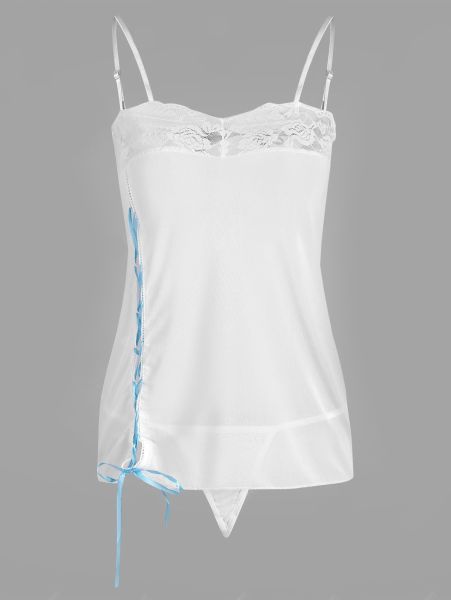 Верх сорочки декорирован эффектным цветочным кружевом. Бретели регулируются по размеру, а голубая шнуровка на боку добавит пикантности.