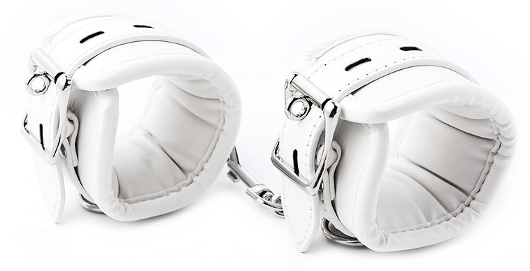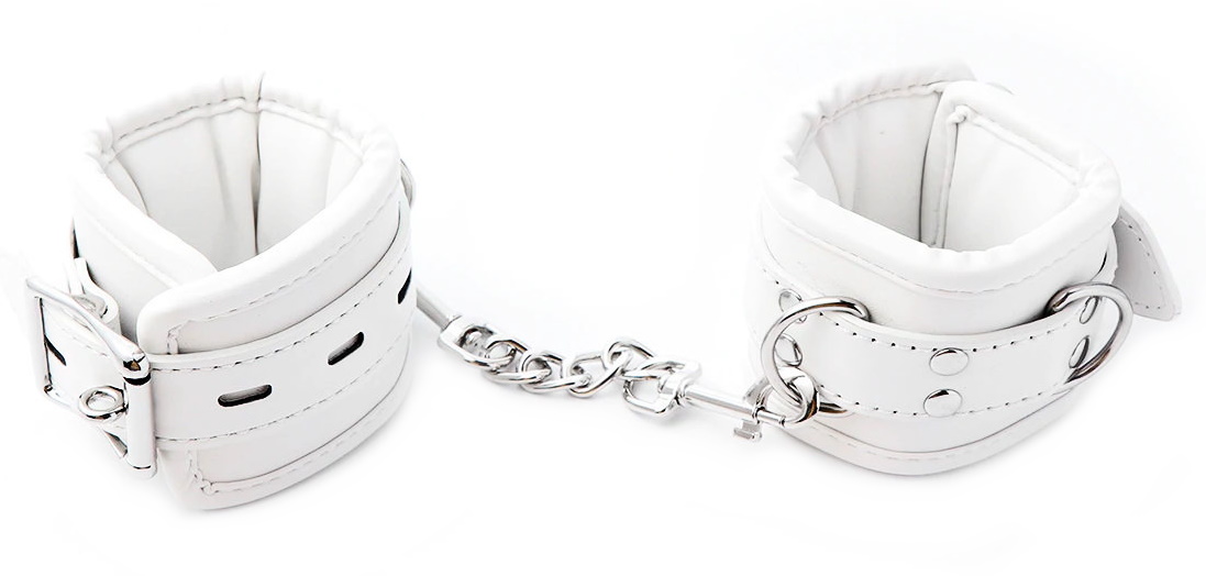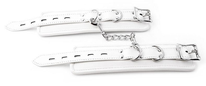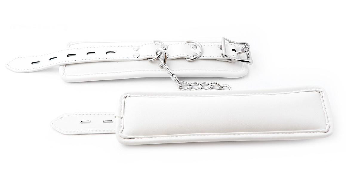 Металлическая фурнитура обеспечивает качественную фиксацию. Наручники соединяются между собой цепью с карабинами, благодаря чему обеспечивается достаточно жесткая сцепка.Размер: ширина 6 см по обхвату регулируются от 15 до 25 см, длина цепочки с карабинами 15 см
