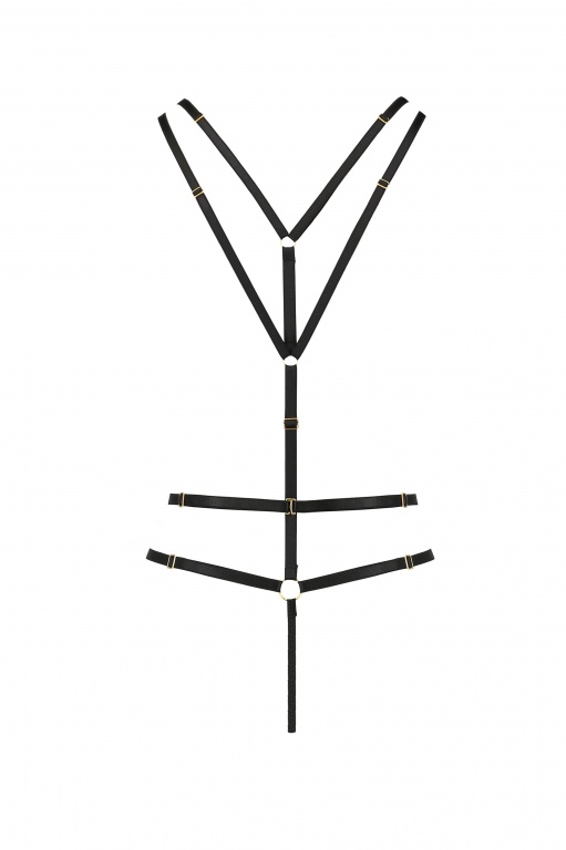 Черное эротическое боди Meggy выполнено из полупрозрачного тюля и эластичных ремешков-резиночек, красиво соединенных между собой металлическими колечками.