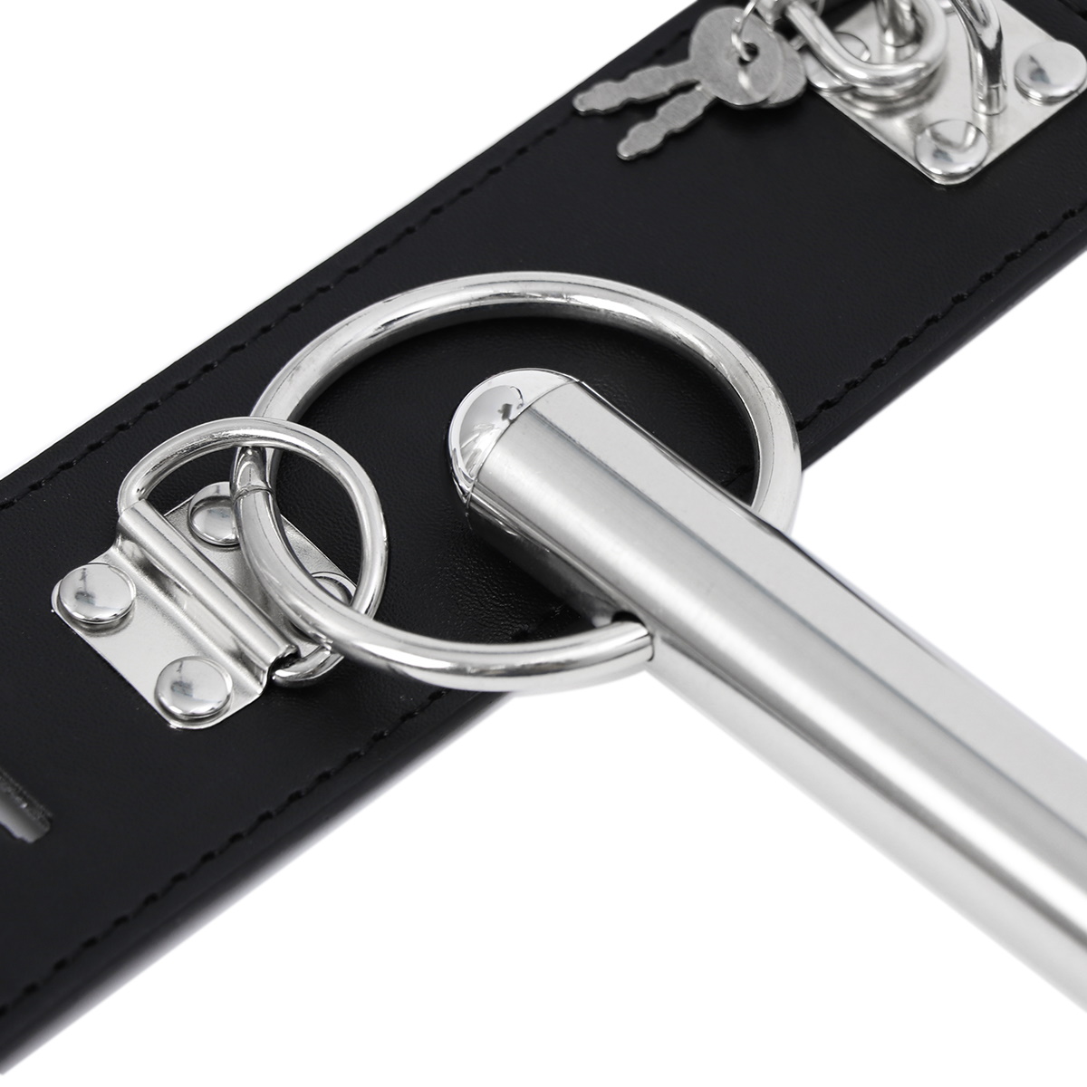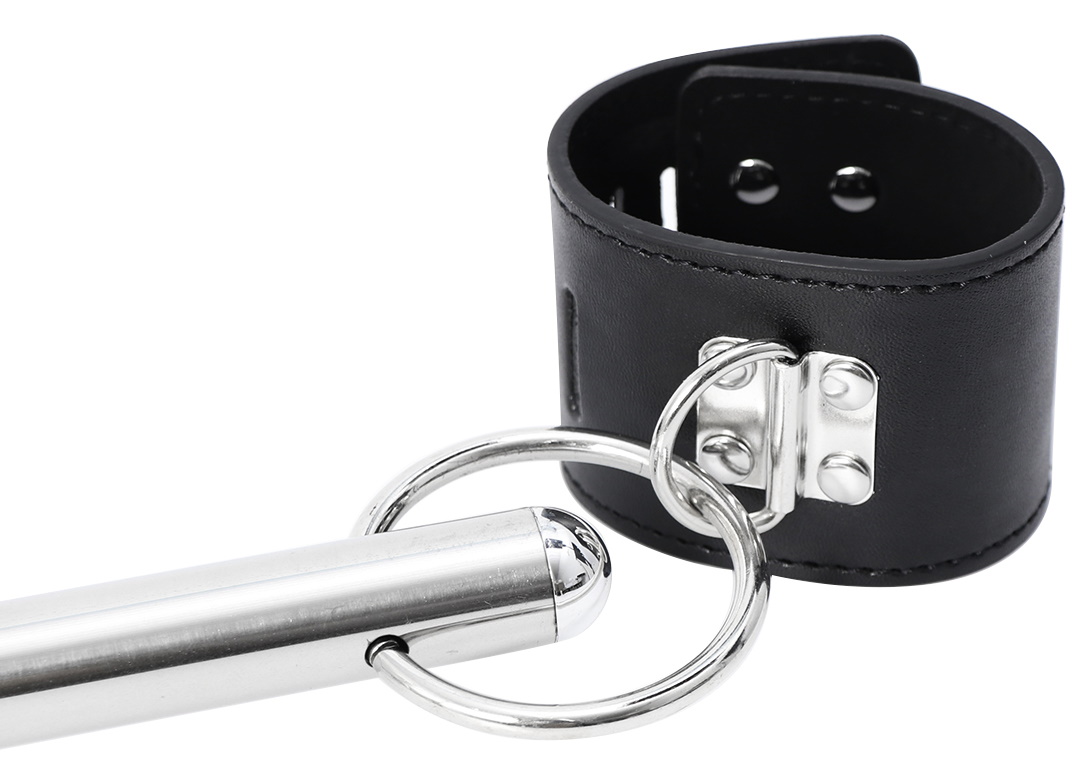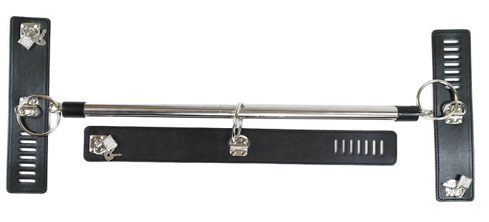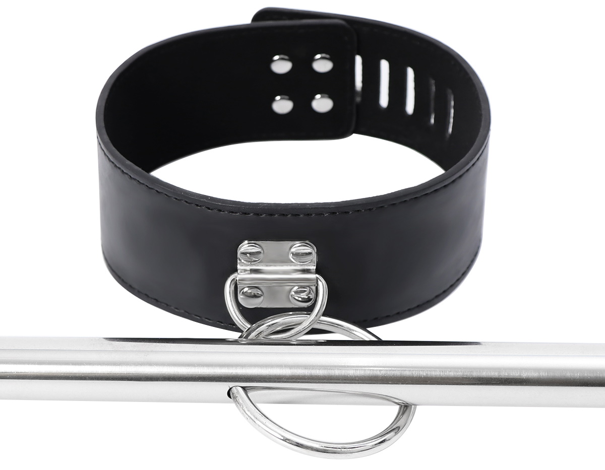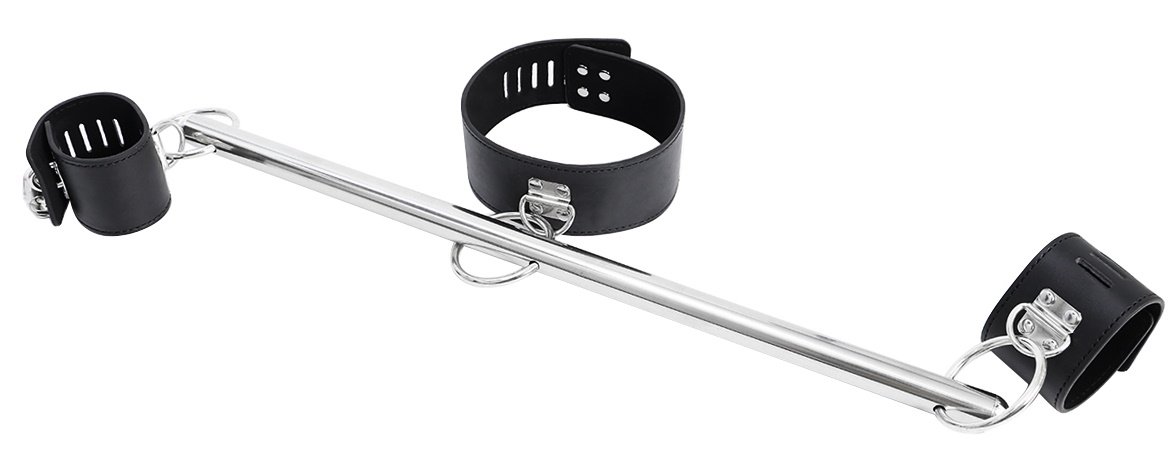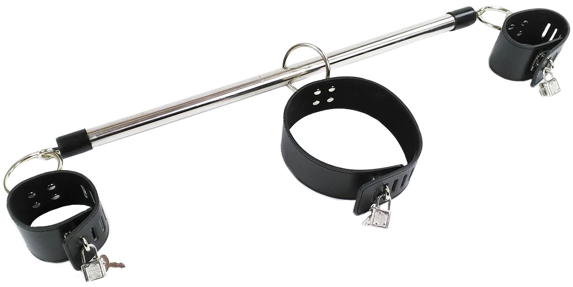 Выполненная из металла серебристого цвета, распорка оснащена креплениями для оков. Наручники и ошейник из искусственной кожи надежно крепятся к распорке, и фиксируются на запястьях и шее.