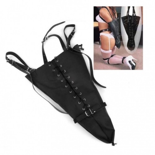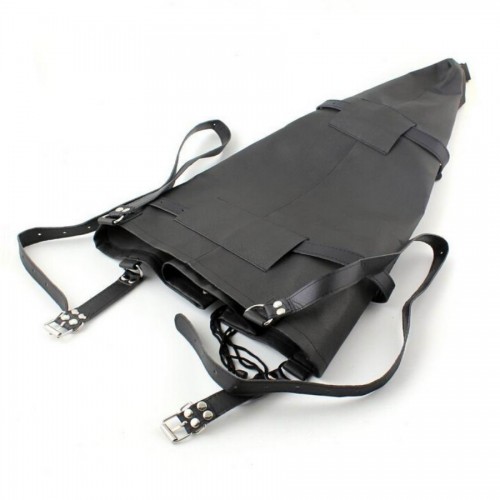 Заплечный бондаж представляет собой большой черный конусообразный рукав со шнуровкой на двух ремнях.
