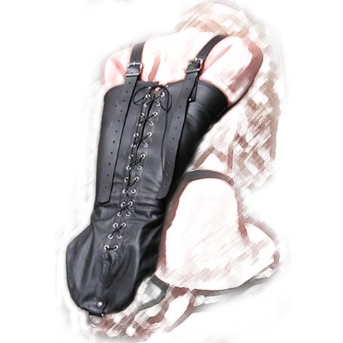 Ремни перекрещиваются и надеваются на плечи сабмиссива, а руки вставляются в рукав и затягиваются шнуровкой! Полное обездвиживание, полный контроль!