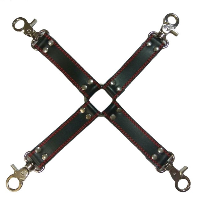 Изготовлена фиксация из кожи, она имеет четыре прочных крепления с карабинами, к которым Вы можете легко и быстро пристегнуть наручники и поножи.
