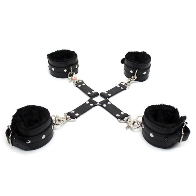 Два поножа и два наручника с плюшем крепятся между собой при помощи карабинов на кольце. Такой набор позволит сковать и обездвижить Вашего раба в любой позе из Вашей самой горячей фантазии. Застегиваются поножи и наручники на ремешки, подойдут для мужских сильных рук и для женских хрупких запястий.