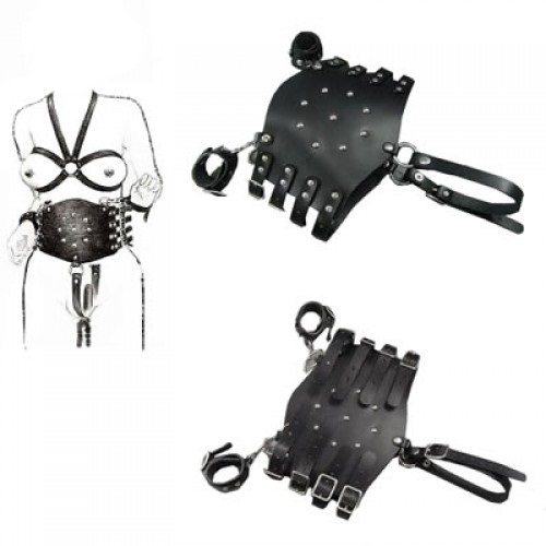 Широкий ремень фиксируется в районе талии, и закрывает часть живота. С каждой стороны по 3 ремешка, расположенных вертикально, для регулирования размера. На одной из сторон есть 2 металлических кольца, к которым крепятся наручники. Фиксировать руки можно как спереди, так и сзади, все зависит от того, как надеть изделие.