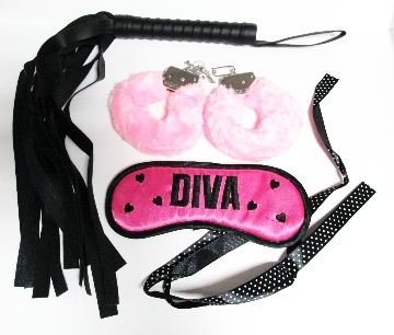 Бондажный набор-Diva. В комплекте металлические наручники с меховой отделкой, плеть - 34 см, маска на глаза завязывается атласными лентами.