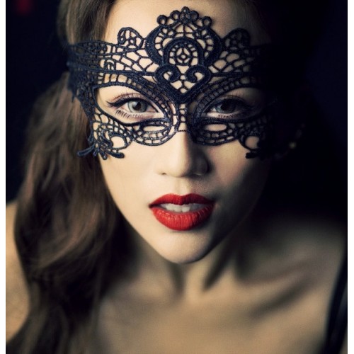 Маска изготовлена из плотного ажурного кружева черного цвета. Крепится с помощью длинной атласной ленточки.