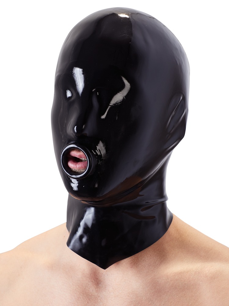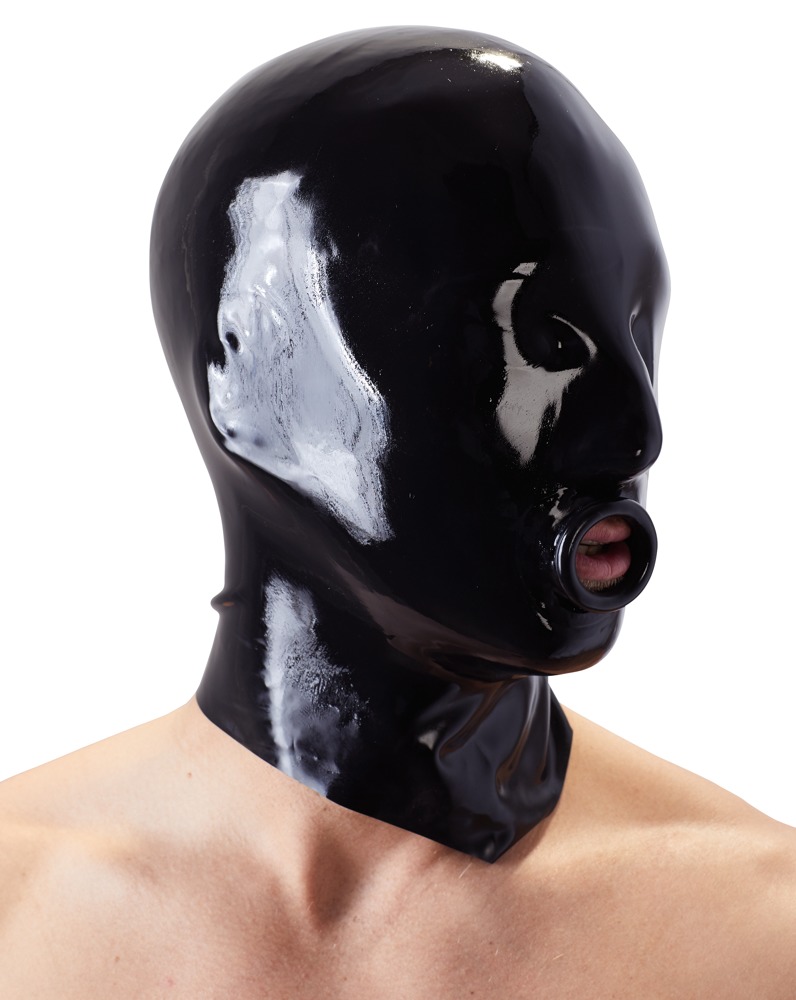 Черная, цельная литая маска на голову из резины с отверстиями для рта.