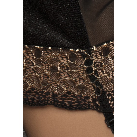 Спинка обнажена. Для чулочков предусмотрены специальные подтяжки. В комплект также входят трусики-стринги.
