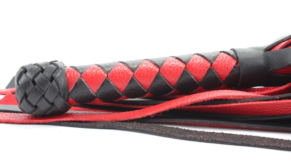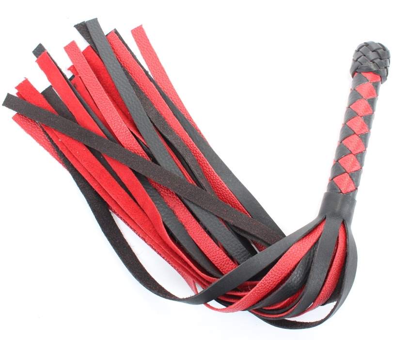 Плеть выполнена из натуральной кожи черного и красного цветов. Черно-красное плетение в виде ромбов на рукоятке и разноцветные хвосты делают аксессуар эффектным.