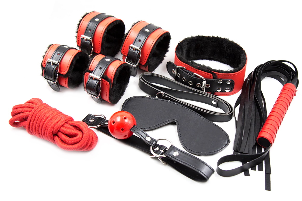 В набор входят: наручники, поножи, плеть, маска для глаз, веревка, кляп-шар и ошейник с поводком.