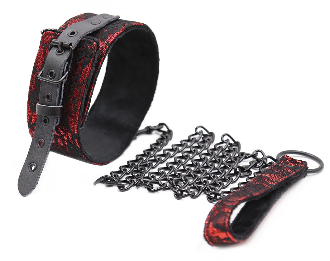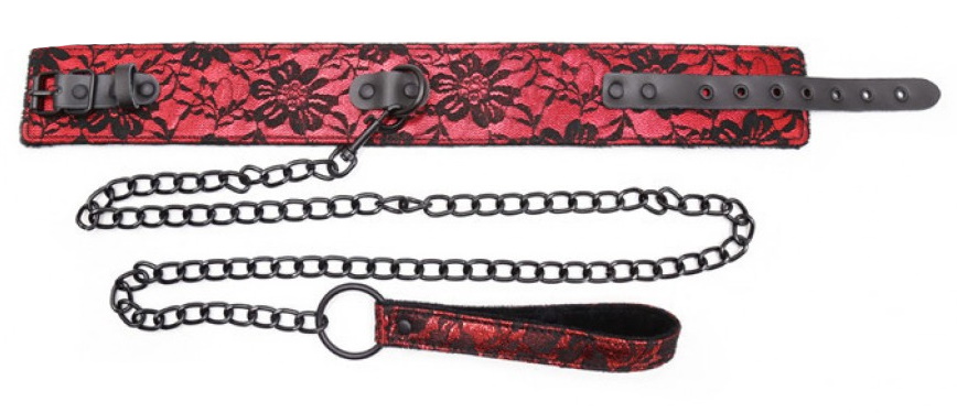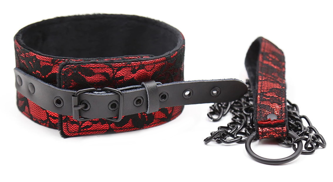 Ошейник выполнен из искусственной кожи красного цвета и декорирован черным кружевом, он комфортно ощущается на шее, не врезаясь и не травмируя ее. Фиксируется ошейник с помощью ремешка и имеет универсальный размер и Вы можете его отрегулировать индивидуально.