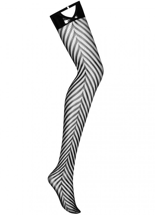 Чулки выполнены из черной сетки плотного плетения. На бедрах вставки из гладкого блестящего материала.