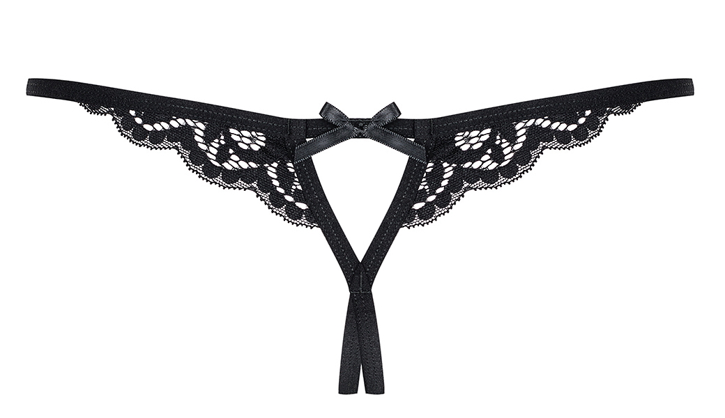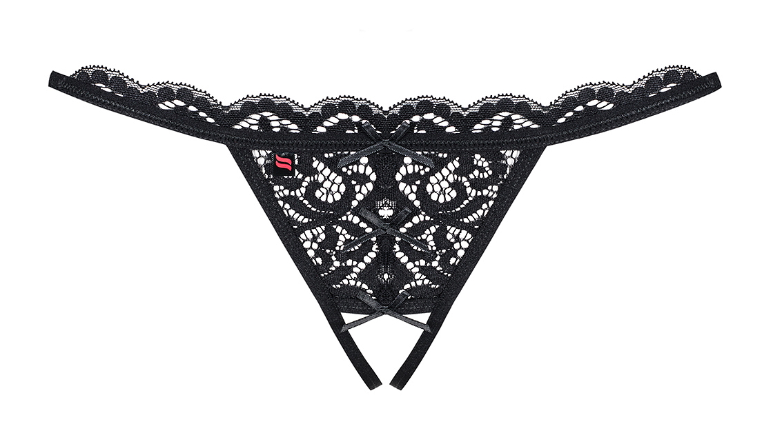 Детали: кружевные стринги с пикантной открытой промежностью, соблазнительные вырезы, украшенные рядом бантов спереди, сексуальная, перекрещивающаяся резинка и атласный бант сзади - соблазнительно обнаженные ягодицы, эластичная, идеально прилегающая к телу ткань.