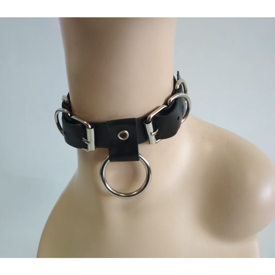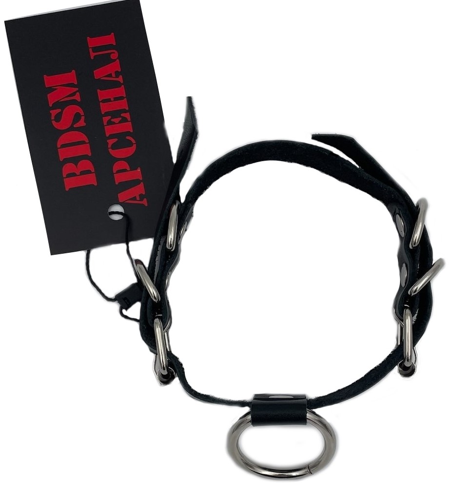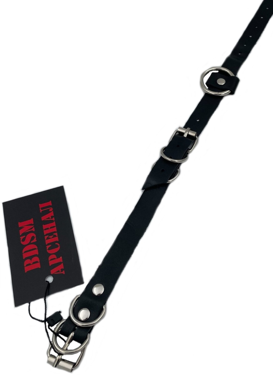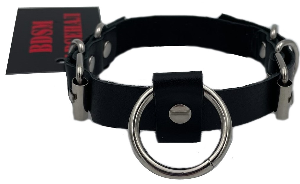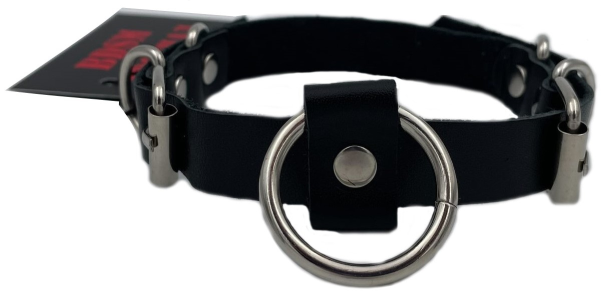Оригинальный черный ошейник, декорированный четырьмя металлическими полукольцами и одним большим кольцом. Крепление в виде застежки.