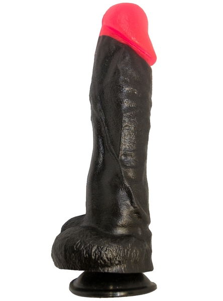 Изделие имеет реалистичный внешний вид: текстурированная выпуклыми венами поверхность, ярко выраженная головка красного цвета и крупная мошонка в целом выглядят в точности, как настоящий пенис мужчины.