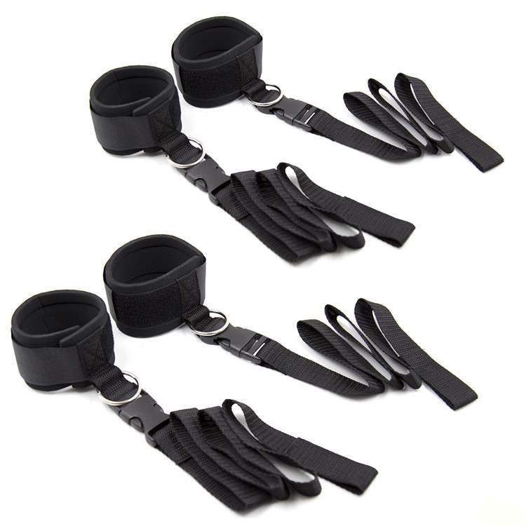 Набор из текстильных ремней с манжетами для рук и ног предназначен для фиксации партнёра к кровати. Размеры наручников и поножей являются универсальными и регулируются с помощью липучки.