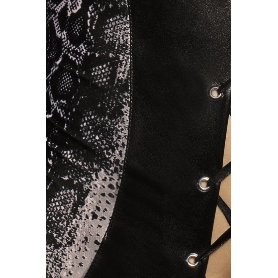 Страстный корсет черного цвета со змеиным принтом. Спереди полностью на шнуровке, с металлическими отверстиями.