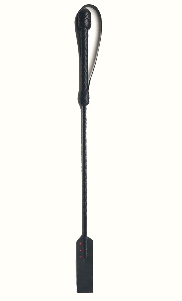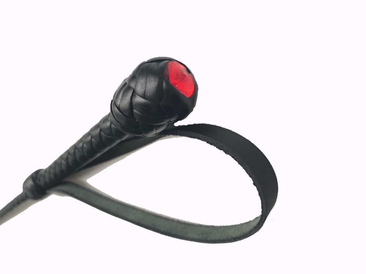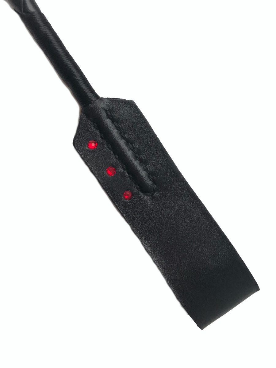 На ручке и окончании стек украшен красными стразами.
