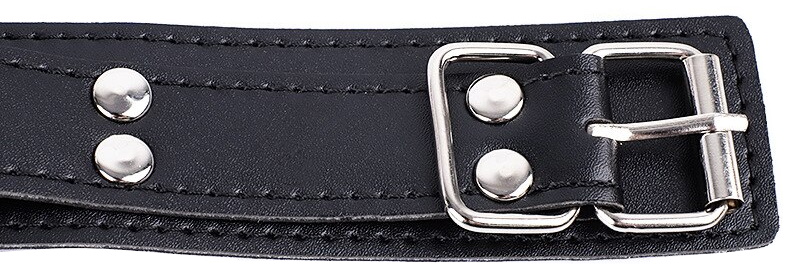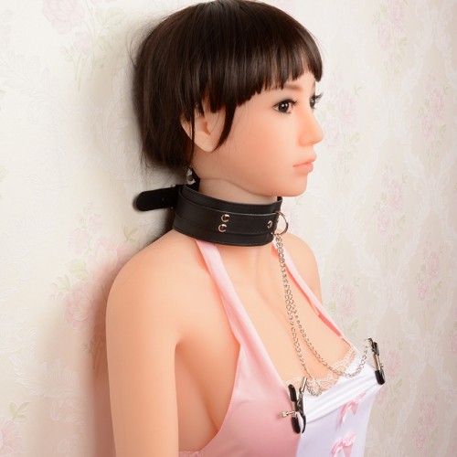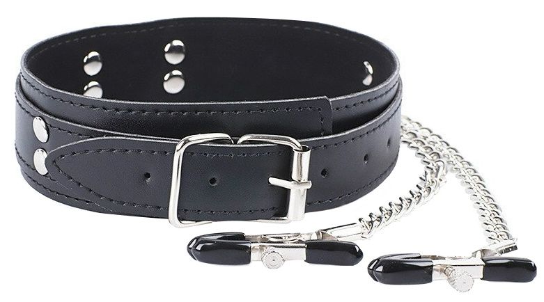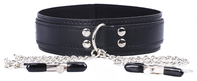 Черный ошейник выполнен из искусственной кожи и украшен заклепками. На двух цепях, отходящих от него, есть зажимы для сосков.