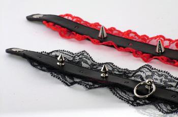 Черный кожаный чокер, с красными ажурными кружевами. Удобная застёжка-клёпка.