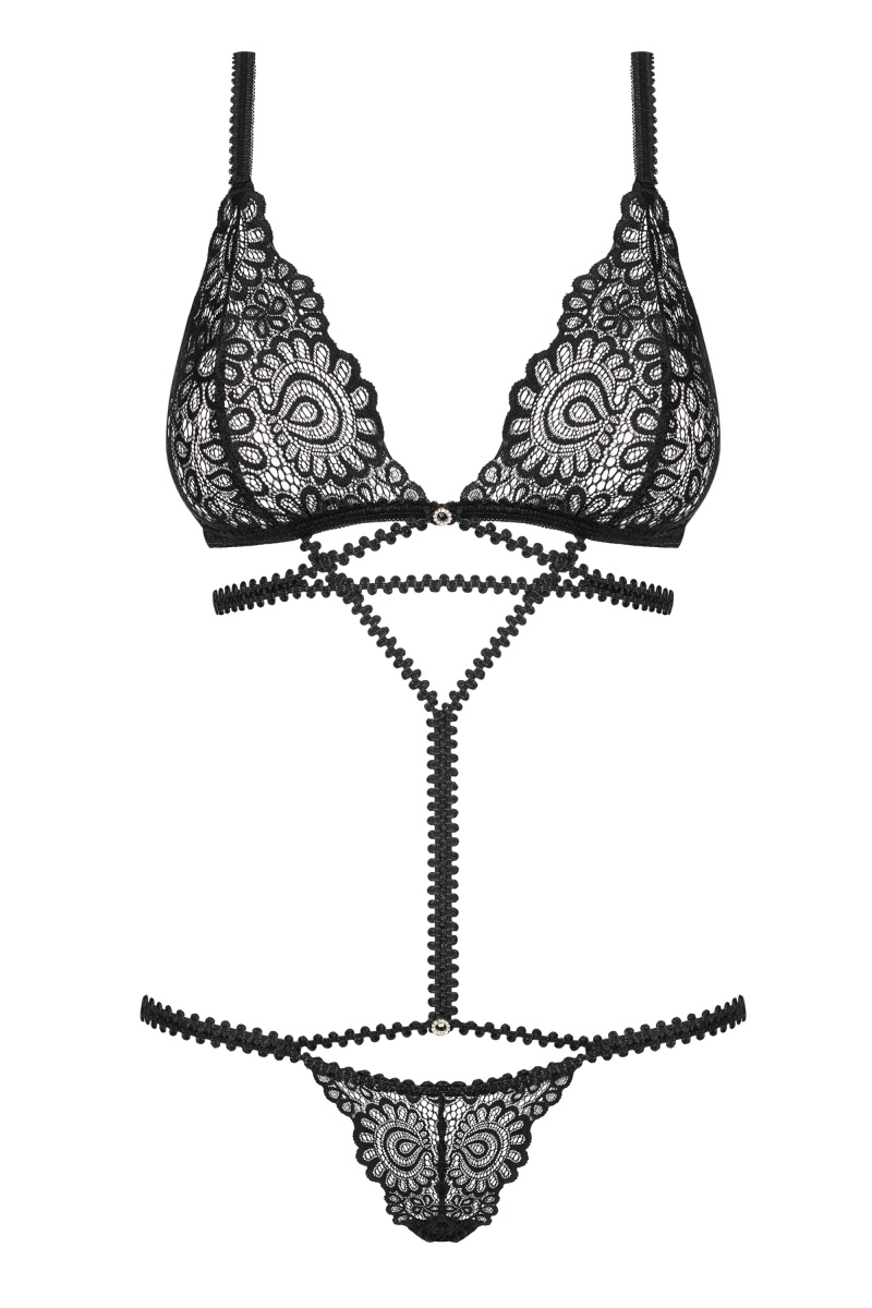 Детали: чрезвычайно интригующее боди, сочетание бюстгальтера и стрингов, регулируемые бретели - идеальная посадка, застежка на спине, интересное сочетание эластичных полос по телу - эффектный вид, красивое кружево с геометрическим узором, два блестящих орнамента добавляют очарования, приятные на ощупь и эластичные материалы - комфорт при ношении.