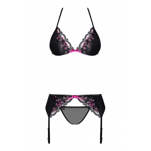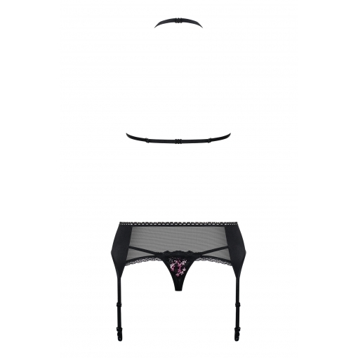 В комплект входит: бюстгальтер, пояс для чулок, трусики.