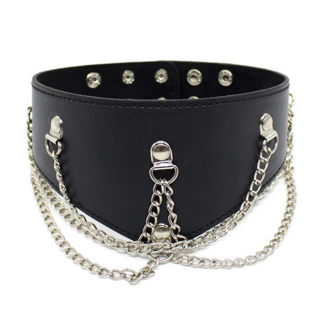 Ошейник с цепочками и заклепками выполненный из мягкой чёрной кожи - это один из самых популярных аксессуаров для интимных ролевых игр в стиле БДСМ.