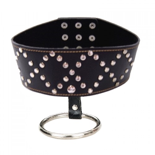 Ошейник украшен металлическими клёпками и имеется стальное кольцом, что даёт возможность пристегнуть поводок.