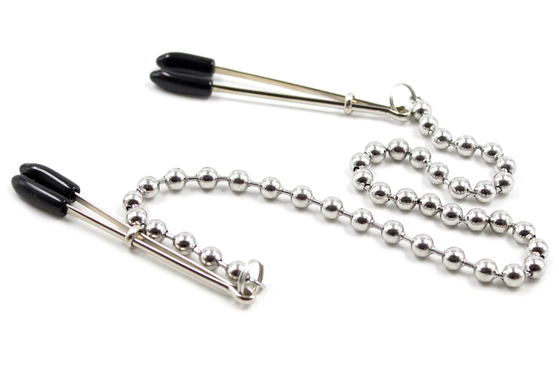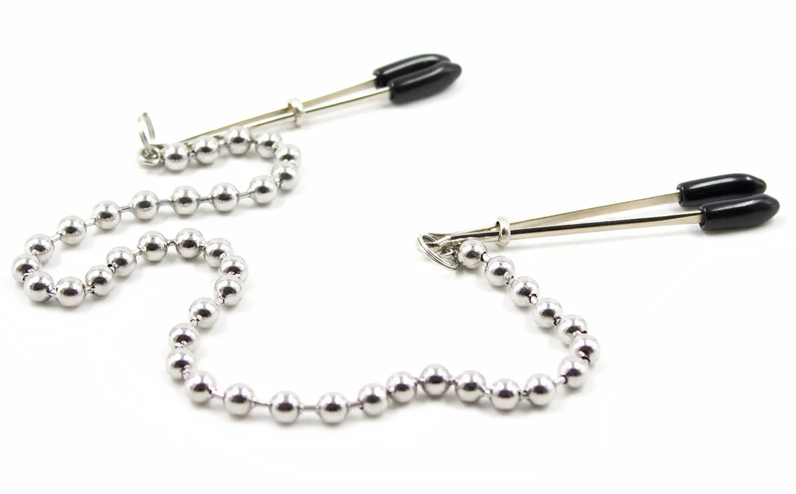 Клипсы на соски, соединенные цепочкой в виде бусин, с возможностью регулировать силу зажима.