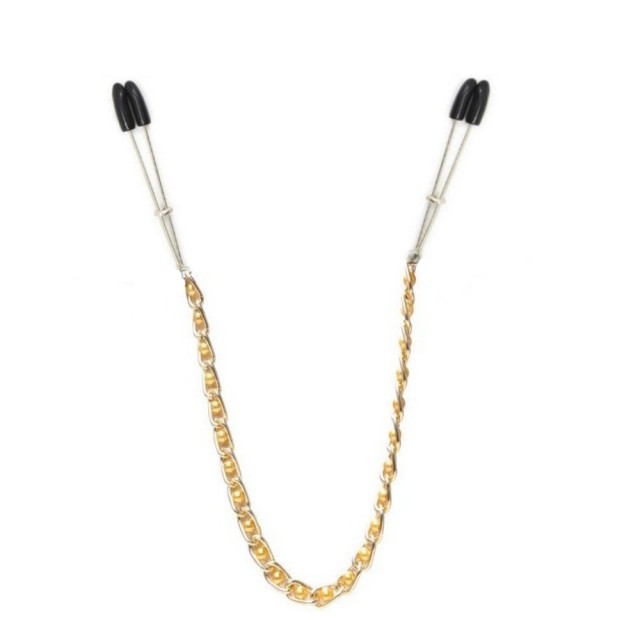 Зажимы изготовлены из прочного металла, сами «прищепки» на кончиках покрыты мягкой резиной для максимального комфорта ощущений. При помощи небольшого регулятора, расположенного на зажимах, Вы сможете регулировать степень жесткости сжатия. Зажимы соединены изящной цепочкой с бусинками, каждое движение которой будет ощутимо стимулировать сосочки, даря вам ни с чем не сравнимое удовольствие!