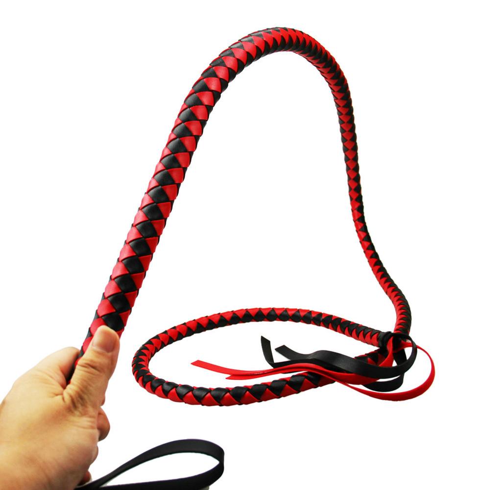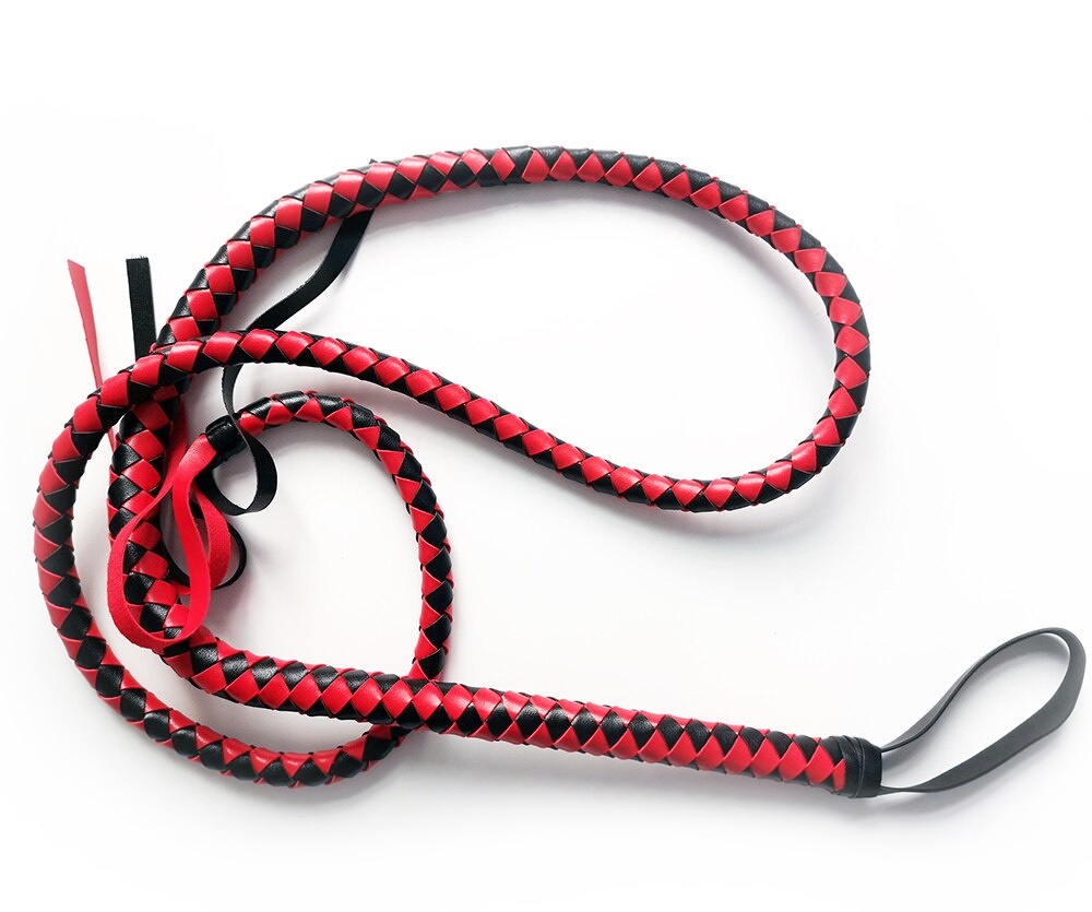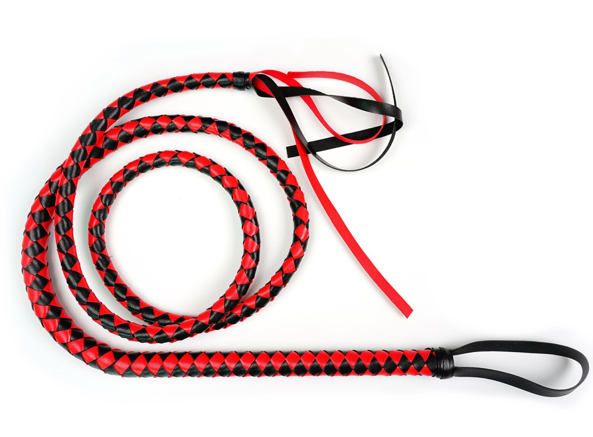 Хлыст черно-красного цвета с переплетениями постепенно утончается к концу, на котором крепятся хлысты.