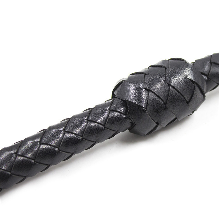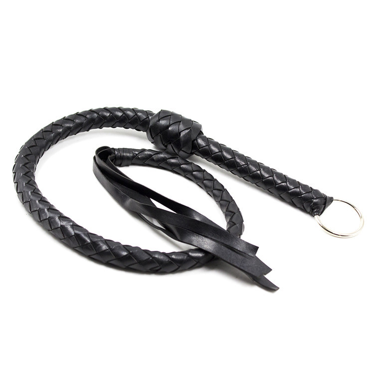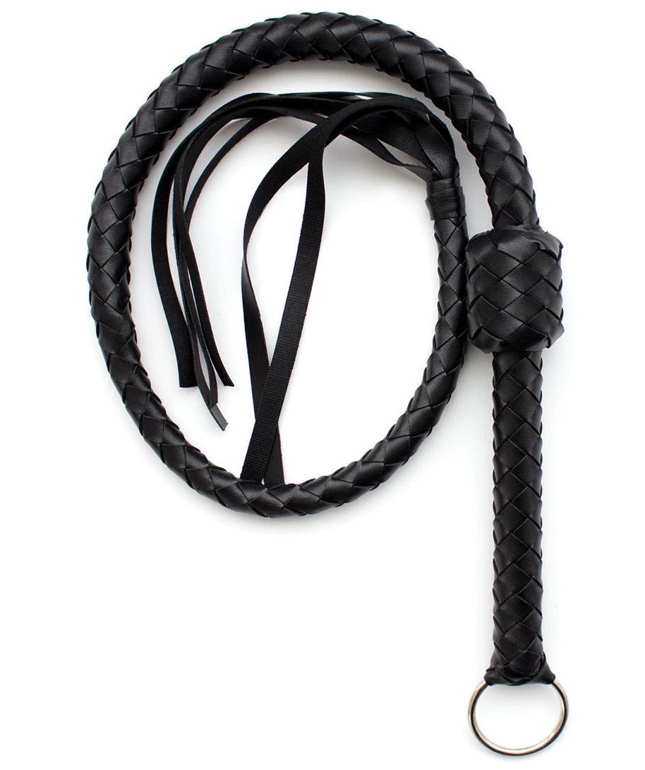 Кнут выполнен из искусственной кожи черного цвета с необычным плетением: он постепенно утончается к концу, на котором крепятся хлысты, на другой стороне кнута расположено удобное кольцо для держания.
