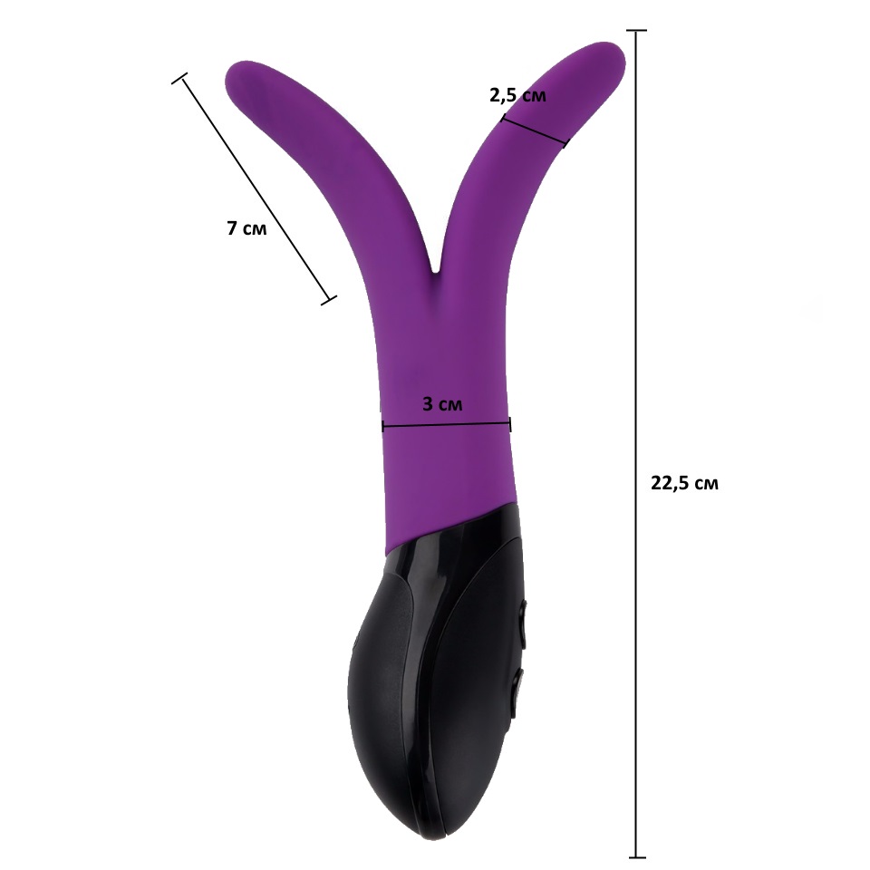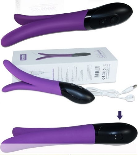Двойной вибратор Violet представляет собой раздвоенную сверху игрушку с тремя мощными моторчиками для еще более интенсивной стимуляции: два на концах лепестков и один на теле массажера.
