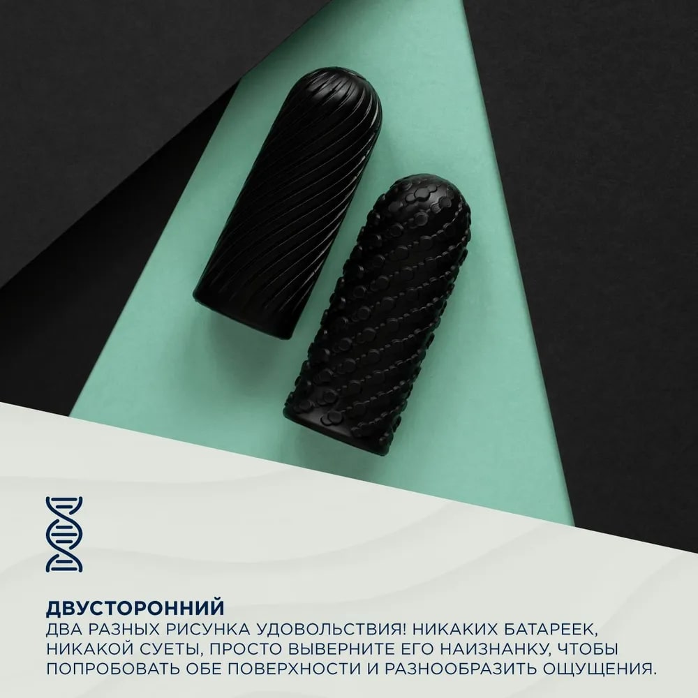 Компактный мастурбатор дает возможность насладится двумя разными рельефами. На внешней стороне расположены закрученные спиралью линии, а на внутренней - выпуклые пупырышки. Достаточно вывернуть рукав наизнанку, чтобы изменить ощущения от стимуляции.