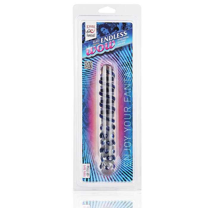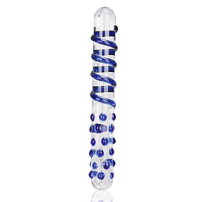 Двусторонний прямой жезл-стимулятор с объемными массажными точками на одной половине и рельефной спиралью на другой. Стимулятор ручной работы из прозрачного закаленного стекла, которое является абсолютно гипоаллергенным и безопасным. Массажные точки и спираль выполнены синим цветом. Общая длина игрушки 20 см, диаметр ствола 2,5 см.