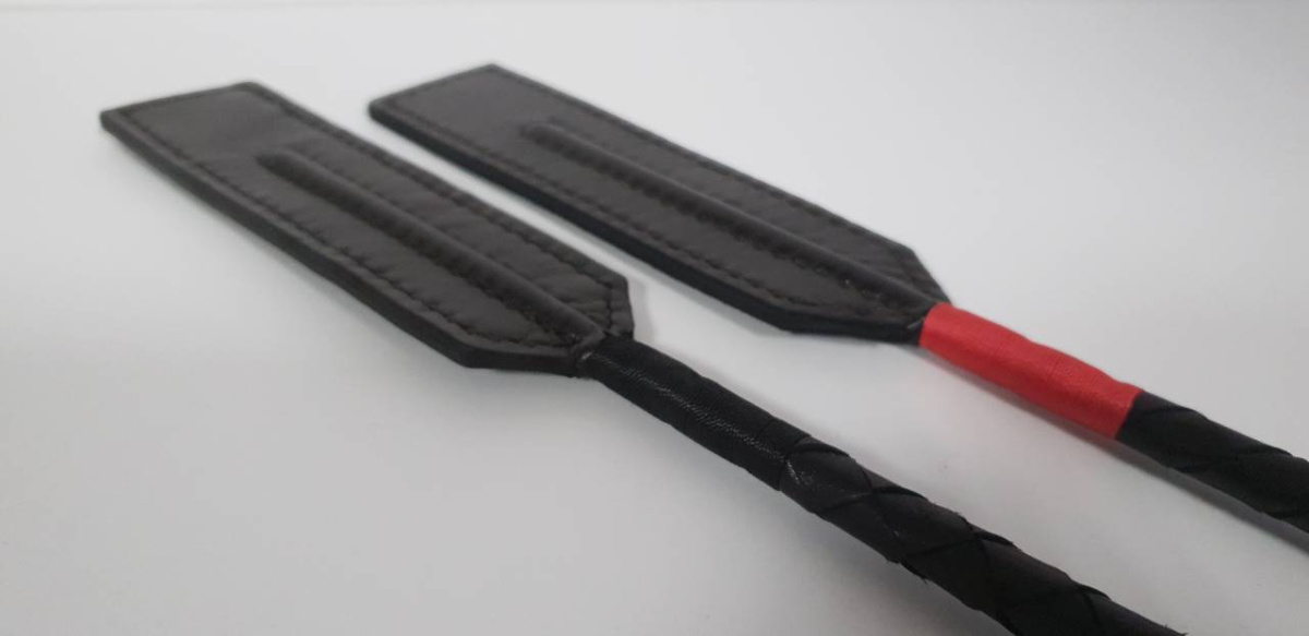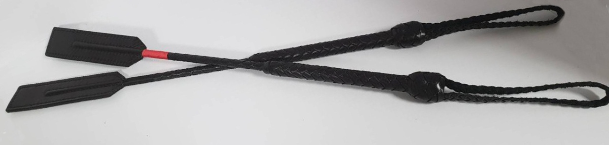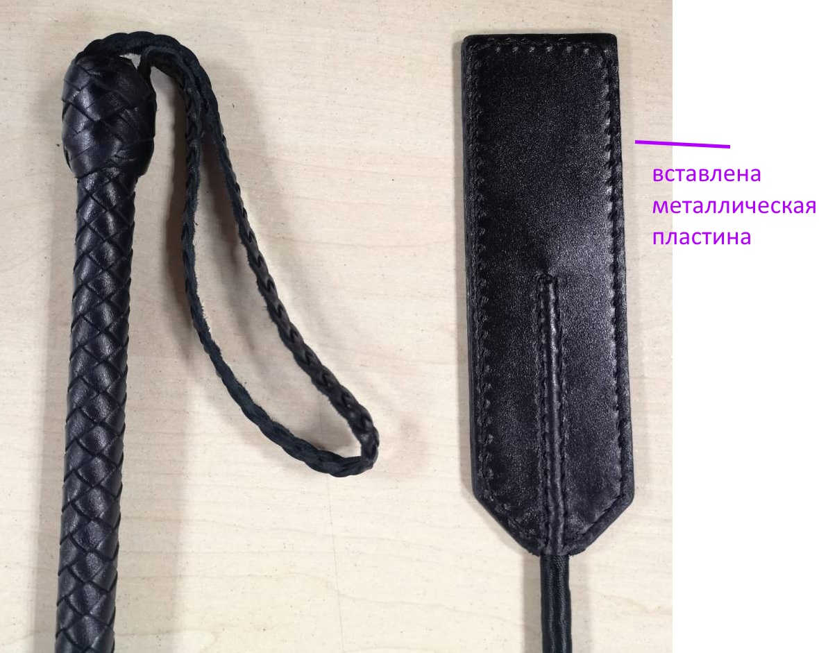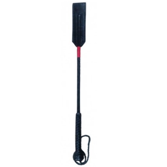 Изящный стек из натуральной кожи, примечателен узкой ручкой с петлей на конце и наконечником имеющим прямоугольную форму.