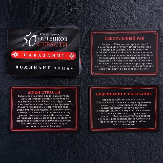 Вытягивайте карточки из соответствующих колод и воплощайте все фантазии в жизнь, а испытать наивысшее наслаждение от игры вам помогут горячие аксессуары.