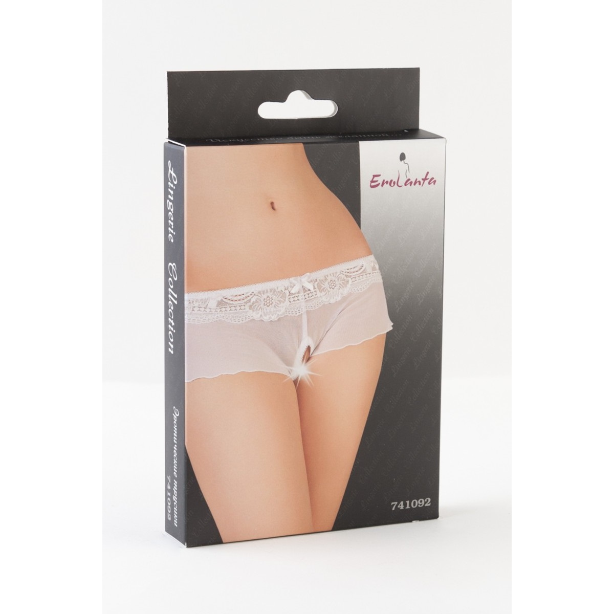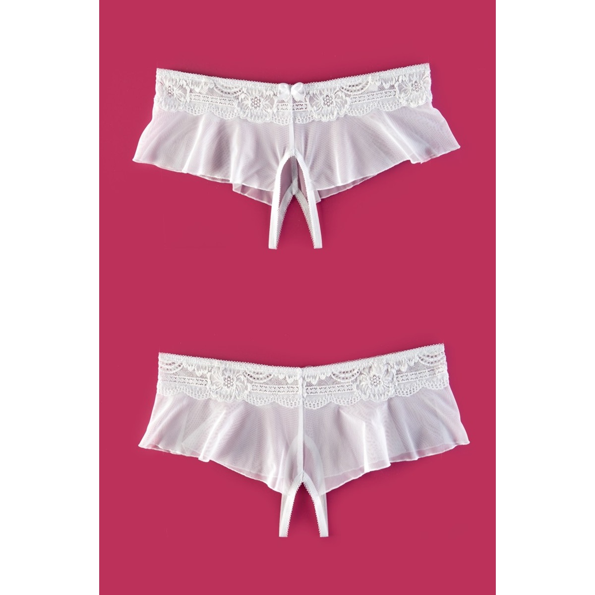 Трусики выполнены из кружевного пояса, с юбочкой в прозрачный сетчатый материал. Имеется разрез в интимной зоне, что позволяет заниматься любовью не снимая этих красивых трусиков.