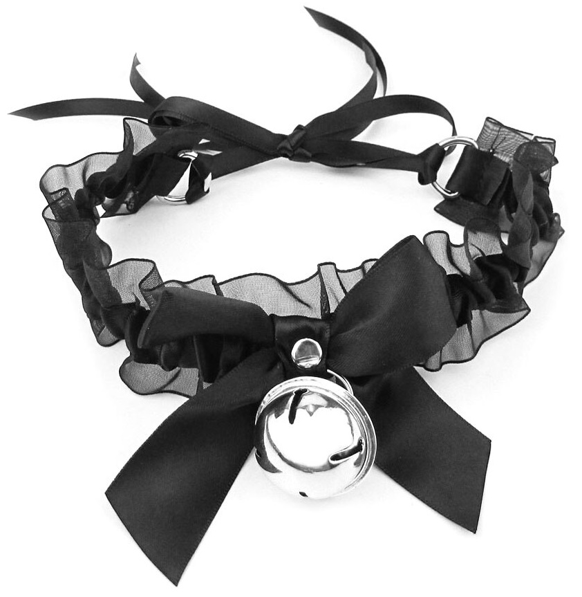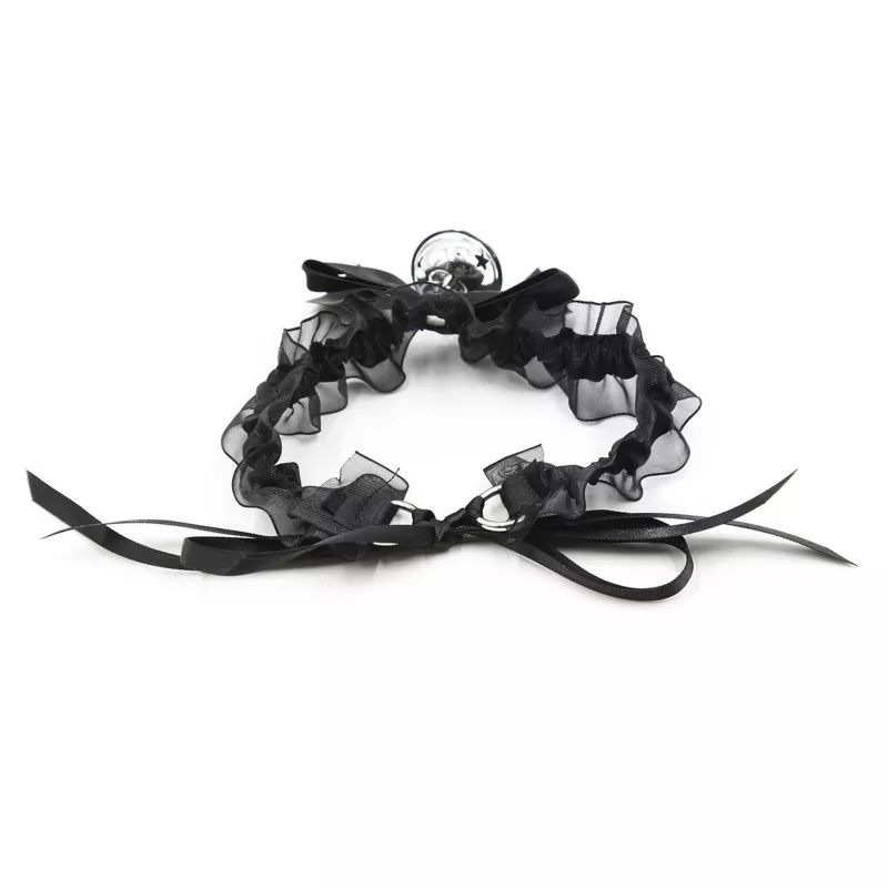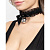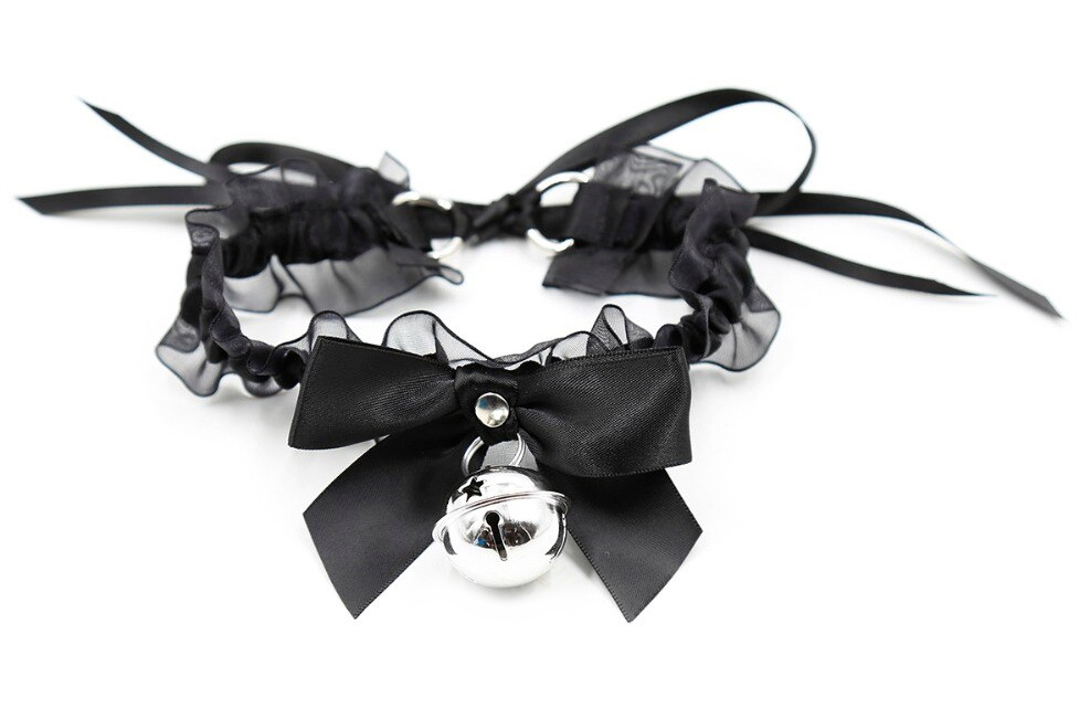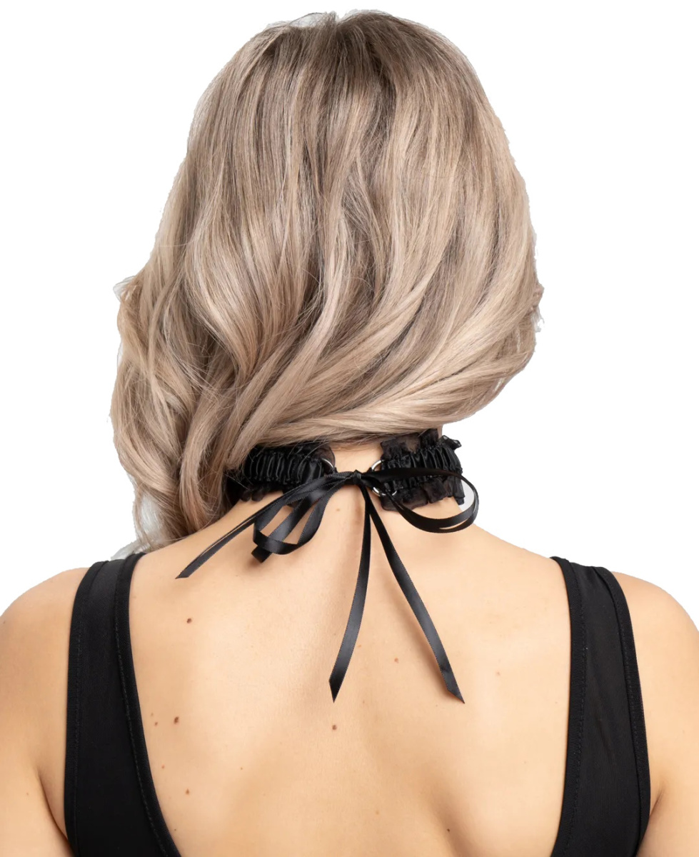 Изящный чокер черного цвета по центру декорирован металлическим кольцом, к которому крепится поводок.