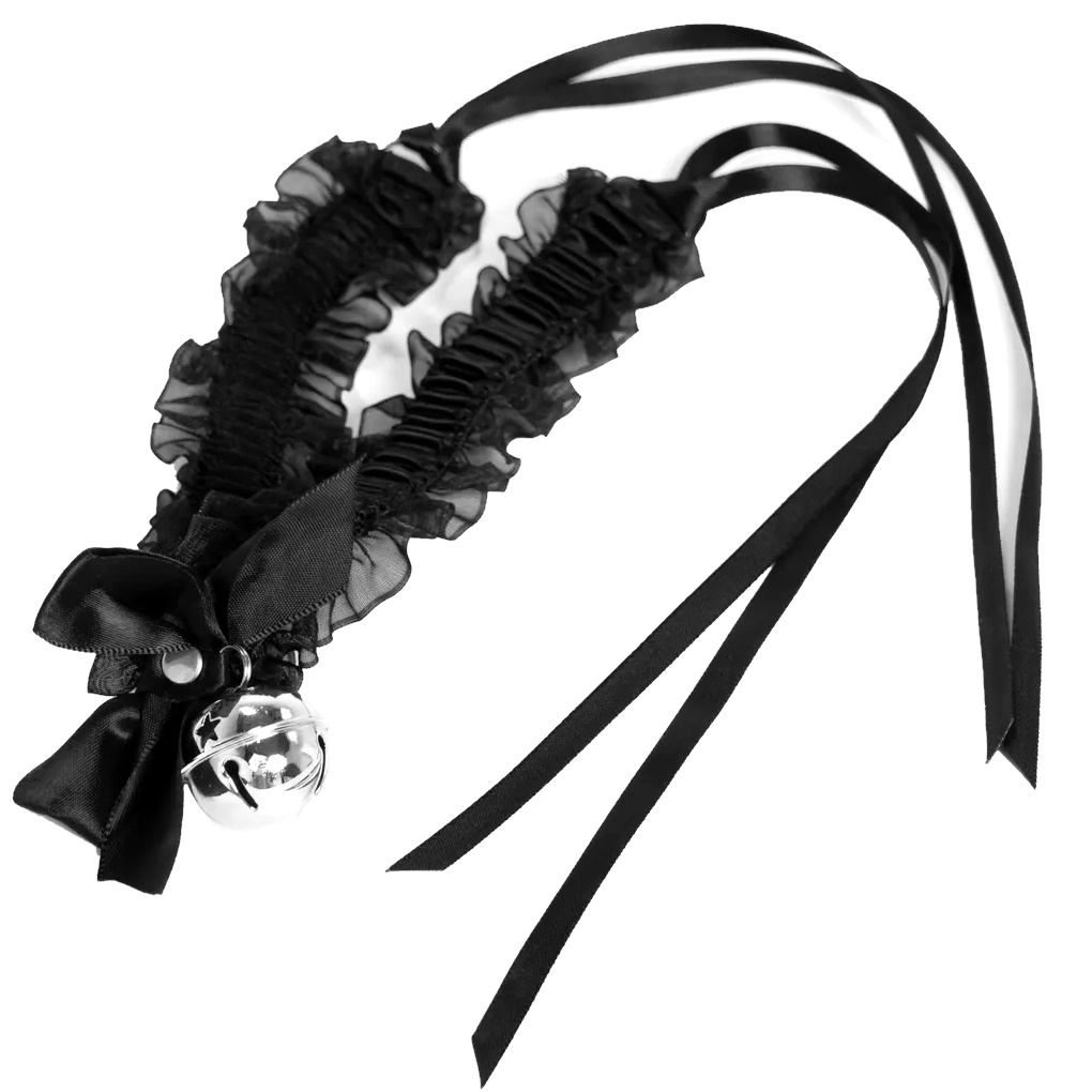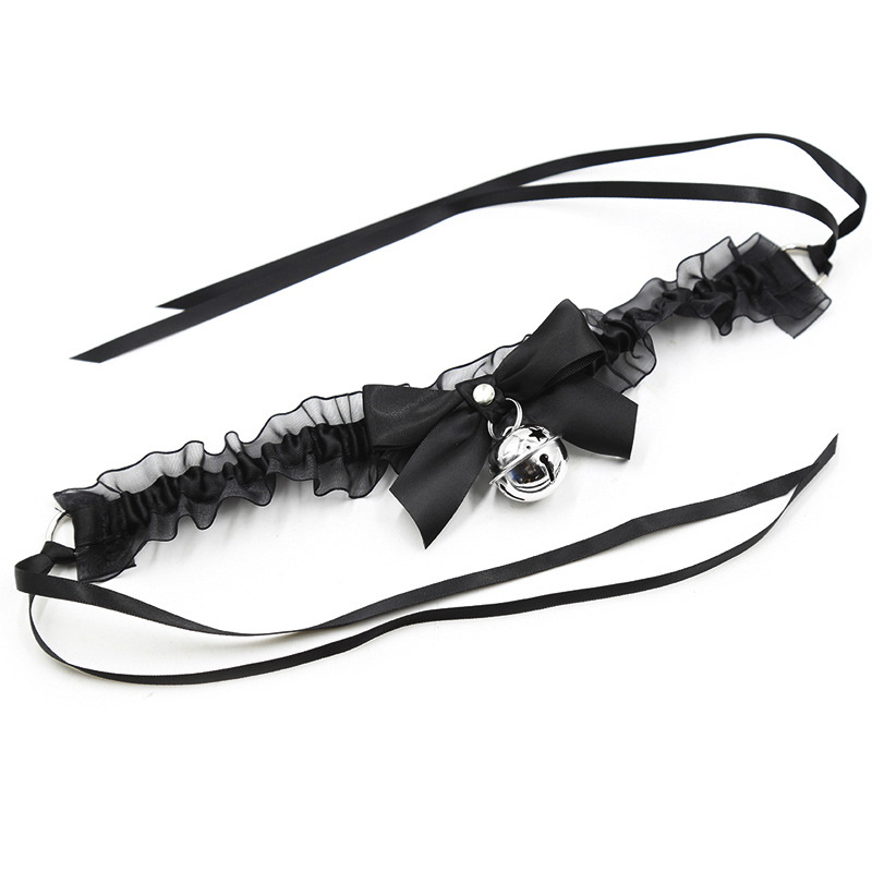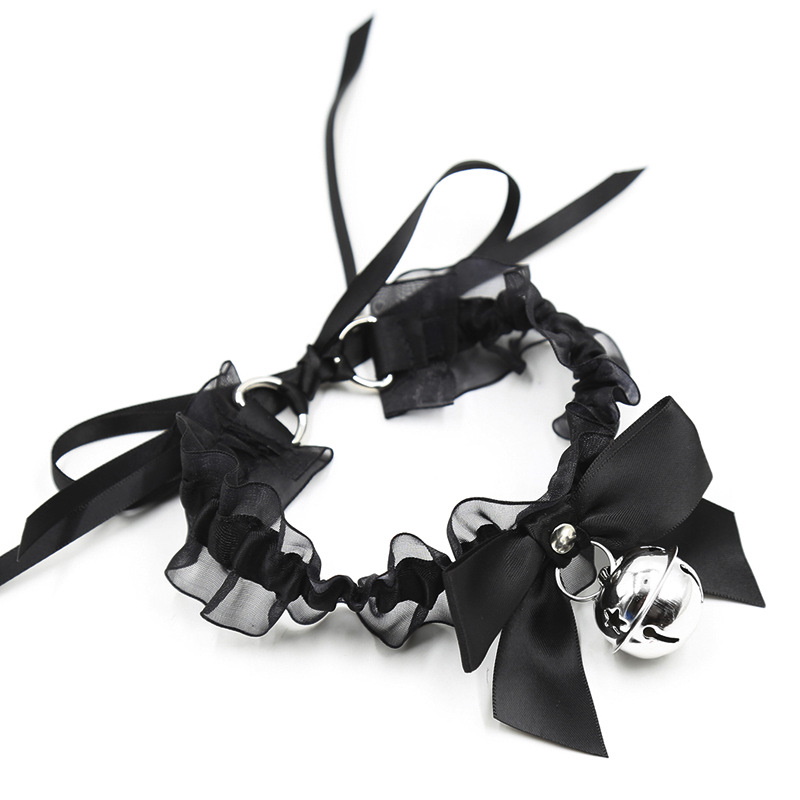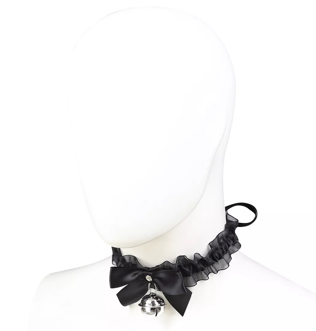Изящный чокер черного цвета по центру декорирован металлическим кольцом, к которому крепится поводок.