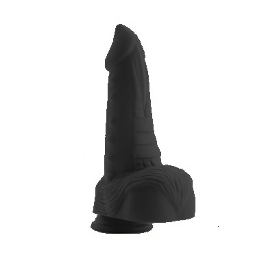 Черного цвета фаллос с острой и гладкой головкой, толстым рельефным стволом, выглядит очень маняще.