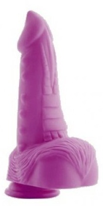 Фиолетового цвета фаллос с острой и гладкой головкой, толстым рельефным стволом, выглядит очень маняще.