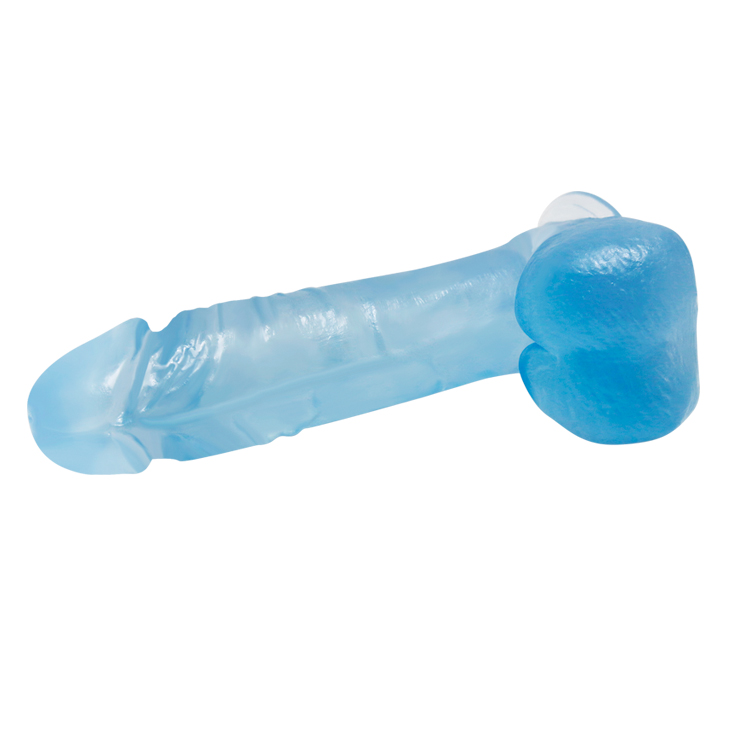 Прозрачно-голубой фаллоимитатор сделан из мягкого желеобразного материала.