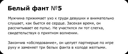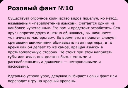 И это отнюдь не преувеличение – фанты предлагают массу привлекательных способов знакомства, причем неважно, парень вы или девушка. Задания на карточках способствуют быстрому сближению между собой и переходу к более тесному общению на любовные темы. Вам не надо будет выдумывать, как бы предложить ей (или ему) перебраться в более уединённое местечко, да и неловкие приставания тоже окажутся ненужными. С игрой Фанты Шуры-Муры всё произойдет само собой – естественно и легко.