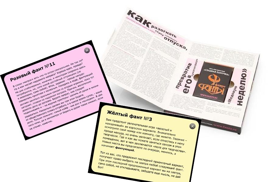 Хотя в игре и есть «мягкие» задания, но некоторые из карточек-фантов по-настоящему «хулиганские», выполнение которых действительно «экстремально». И именно здесь начинается главное: переходя от одного задания к другому, вы все больше забываете про «заржавевшие тормоза», однообразие и скуку в постели. Ведь игра «СЛАДКАЯ ПАРОЧКА» разработана для людей, предпочитающих выходки бурной молодости маринованию грибов на даче.