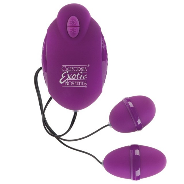 Фиолетовый вибростимулятор состоящий из двух виброяичек разного размера и пульта управления функциями и скоростью массажеров.